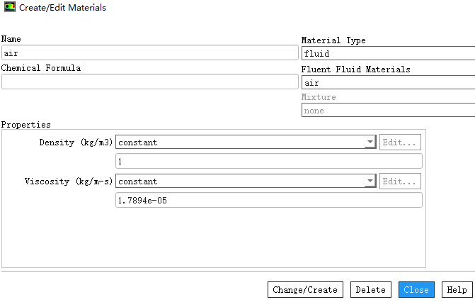 鼠标双击模型树节点Materials > fluid > air,弹出材料属性设置对话框,如下图所示设置密度与粘度