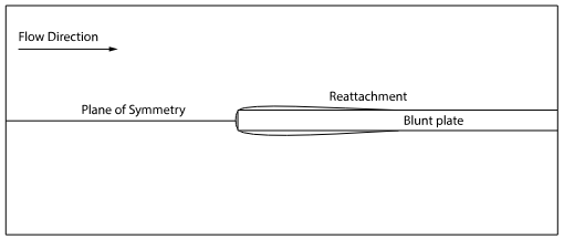本案例计算模型如图所示。仿真计算钝头体前缘流动分离后再附着现象。考虑模型的对称性,计算时只采用一半几何模型。基于板厚的雷诺数为260。