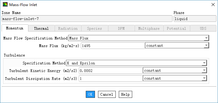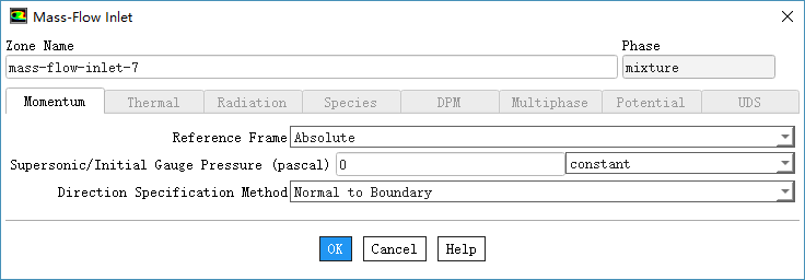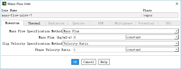鼠标双击模型树节点Boundary Conditions > mass-flow-inlet-7 > vapor,弹出对话框中如下图所示设置入口气相质量通量为0