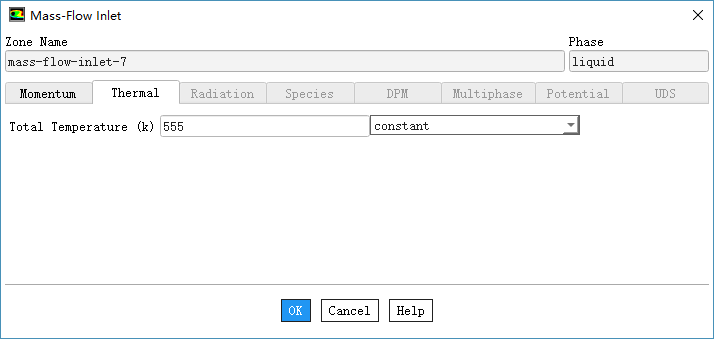 鼠标双击模型树节点Boundary Conditions > mass-flow-inlet-7 > liquid,切换至Thermal标签页,如下图所示设置液相温度为555 K