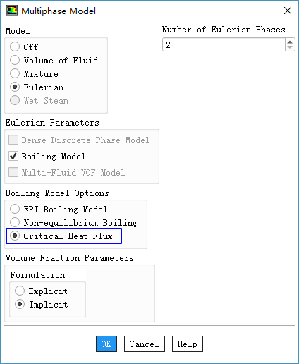 鼠标双击模型树节点Models > Multiphase,弹出对话框中如下图所示,选择Eulerian,并选择Boiling Model及Critical Heat Flux