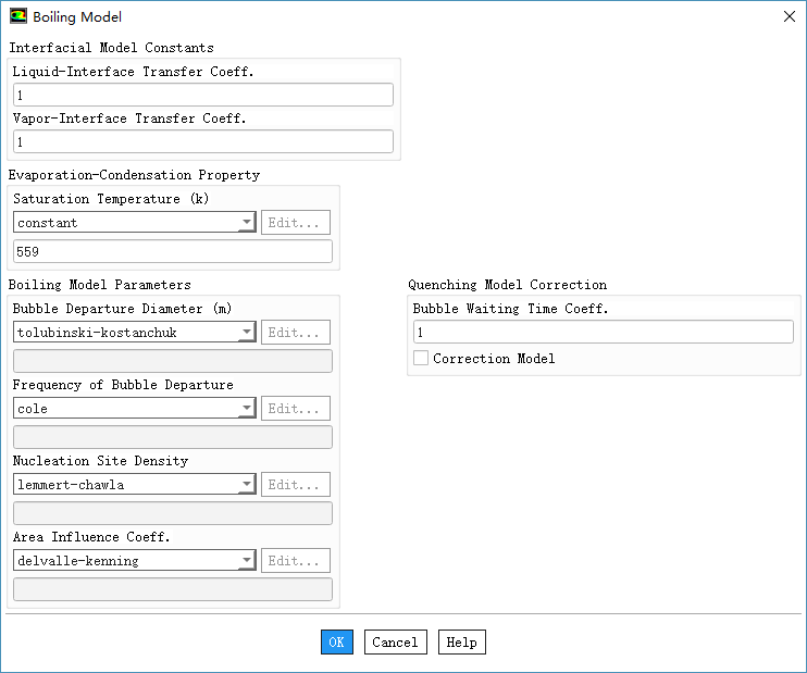 点击Eidt…按钮进入沸腾模型设置对话框,如下图所示进行参数设置