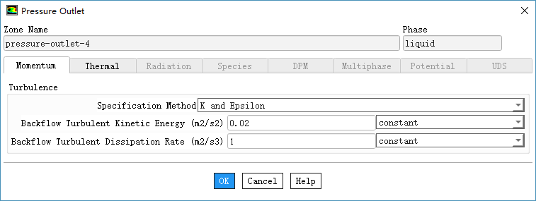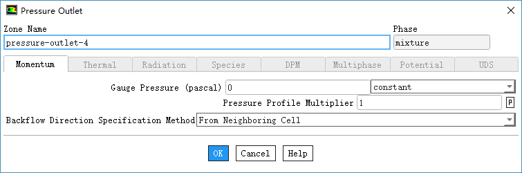 鼠标双击模型树节点Boundary Conditions > pressure-outlet-4,弹出对话框中如下图所示设置参数