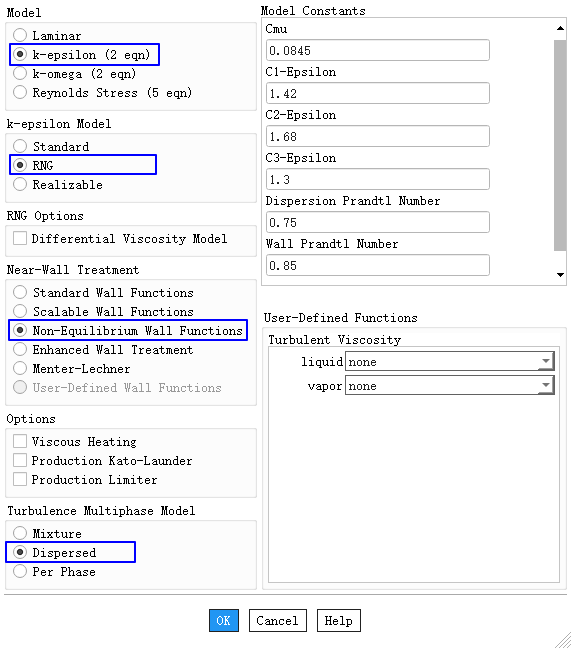 鼠标双击模型树节点Models > Viscous,弹出的模型设置对话框中选择RNG k-epsilon湍流模型,选择选项Non-Equilibrium Wall Functions,如下图所示