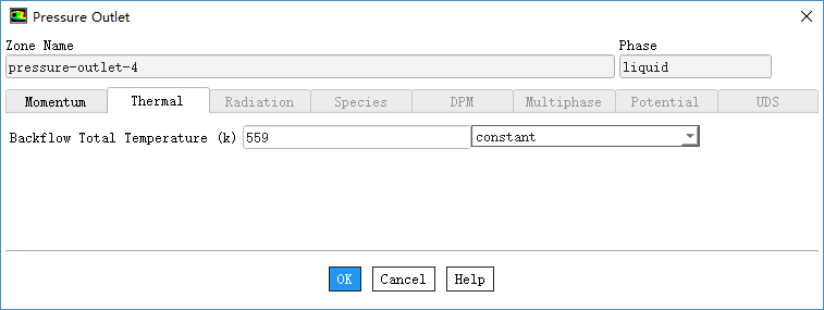 鼠标双击模型树节点Boundary Conditions > pressure-outlet-4> liquid,如下图所示设置出口液相温度