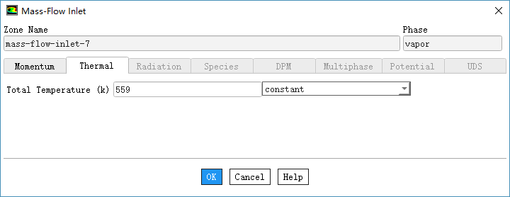 鼠标双击模型树节点Boundary Conditions > mass-flow-inlet-7 > vapor,切换至Thermal标签页,如下图所示设置温度为559 k