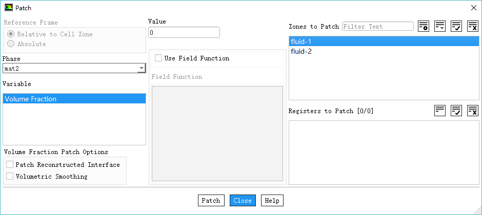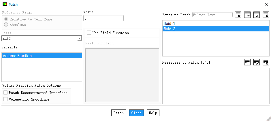 鼠标双击模型树节点Initialization,右侧面板点击按钮Patch…,弹出对话框中指定fluid-1的材料为mat1,如下图所示