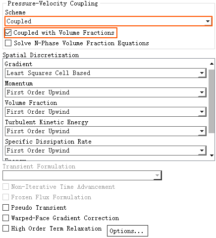 双击模型树节点Methods,右侧面板选择Coupled,并激活选项Coupled with Volume Fractions