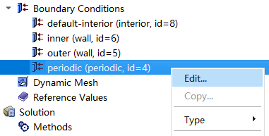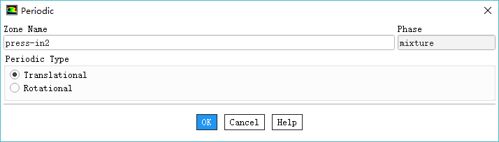 鼠标双击模型树节点Boundary Conditions,右侧面板中选中列表项press-in1,点击按钮Periodic Conditions…弹出设置对话框,如下图所示设置压力梯度