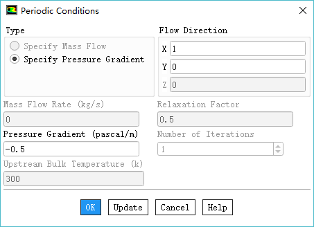 鼠标双击模型树节点Boundary Conditions,右侧面板中选中列表项press-in2,点击按钮Periodic Conditions…弹出设置对话框,如下图所示设置压力梯度