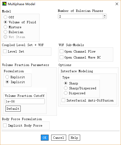 鼠标双击模型树节点Models > Multiphase,弹出对话框中如下图所示,选择Volume of Fluid