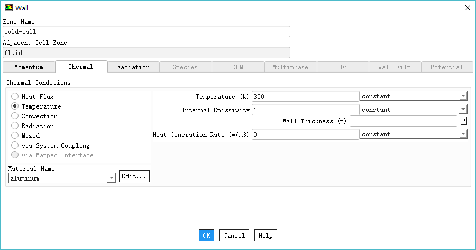 鼠标双击模型树节点Boundary Conditions > cold-wall弹出设置对话框