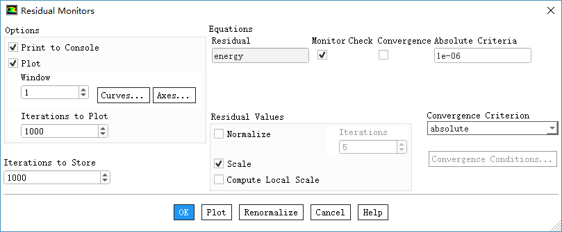 双击模型树节点Monitors > Residual,弹出设置对话框,如下图所示进行参数设置