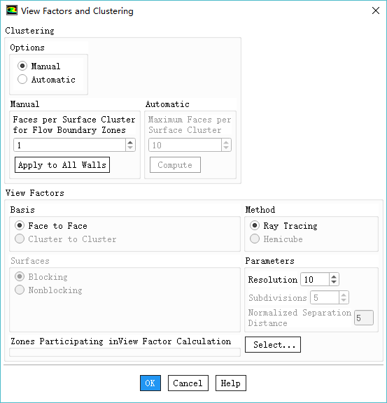 注:该对话框提供了一些用于角系数计算的方法,对于本案例来讲,采用默认参数即可。