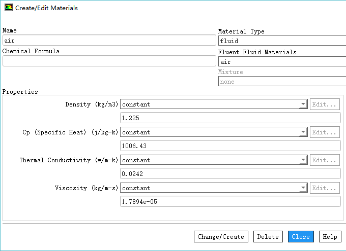 鼠标双击模型树节点Materials > Fluid > air弹出材料属性设置对话框