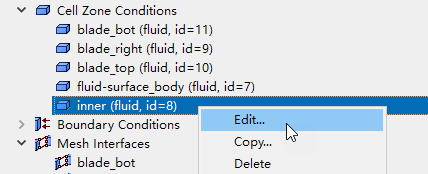 右键选择模型树节点Cell Zone Conditions > inner,点击弹出菜单项Edit…,打开设置对话框