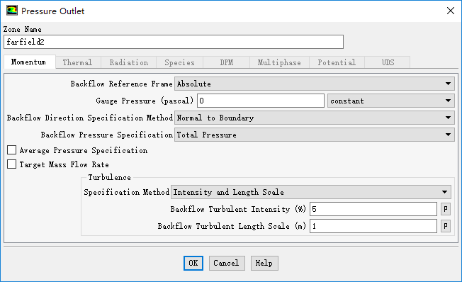 右键选择模型树节点Boundary Conditions > farfield2,点击弹出菜单项Type → pressure-outlet,弹出参数设置对话框
