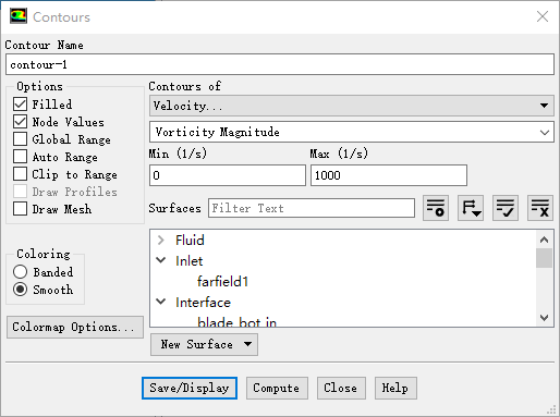 双击模型树节点Results > Graphics > Contours,弹出云图设置对话框,如下图所示设置