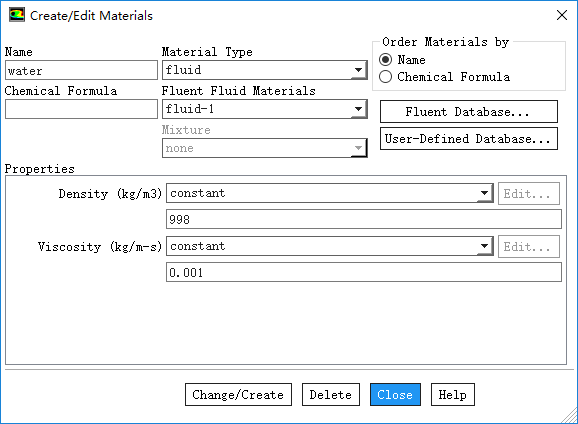 添加新材料water,设置其密度为998 kg/m3,粘度为0.001 kg/m-s,点击按钮Change/Create,在弹出的询问是否覆盖的对话框中选择Yes,点击Close按钮关闭材料对话框