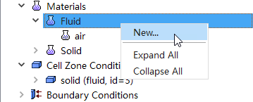 右键选择模型树节点Materials > Fluid,点击弹出菜单项New…打开材料新建对话框