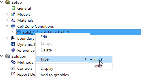 右键选择模型树节点Cell Zone Conditions > solid_1_1_solid,点击菜单项Type → fluid,弹出区域设置对话框