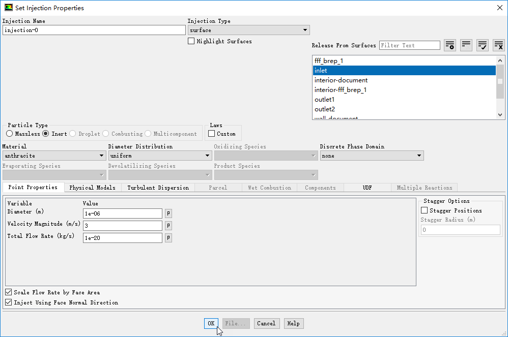 在入射器设置对话框中,设置Incection Type为Surface,选择inlet作为入射口,设置颗粒的X-Velocity为3 m/s