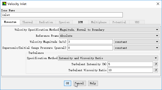 双击模型树节点Boudnary > Inlet,弹出入口边界设置对话框,在Momentum标签页中设置Velocity Magnitude为3 m/s
