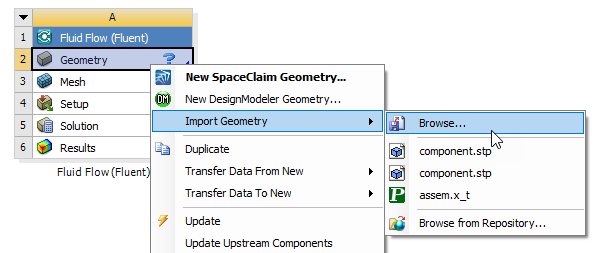 右键选择A2单元格,选择菜单Import Geometry → Browse…,在弹出的文件选择对话框中选择几何文件cyclone.stp