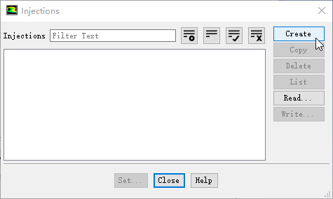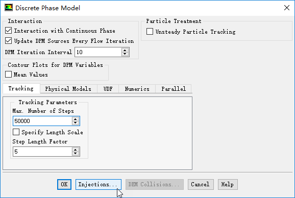 激活选项Iteraction with Continuous Phase及Update DPM Source Every Flow Iteration,点击按钮Injections…打开入射器设置对话框