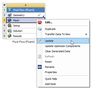 关闭mesh模块,返回至Workbench界面,右键选择A3单元格,选择弹出菜单Update更新网格