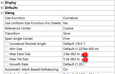 点击模型树节点Mesh,在属性窗口中设置Max Face Size为2.8e-2m,设置max Tet Size为5.5e-2 m