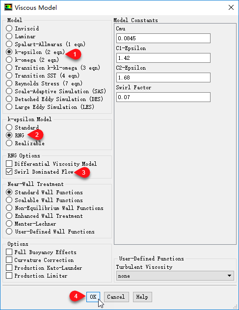 鼠标双击模型树节点Models > Viscous,弹出湍流模型设置对话框,选择k-epsilon(2 eqn)模型,选择子模型为RNG,激活选项Swirl Dominated Flow,点击OK按钮关闭对话框