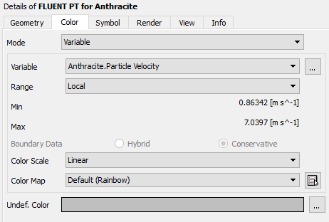 双击节点FLUENT PT for Anthracite,属性窗口中切换至Color标签页,设置Mode为Variable,设置Variable为Anthracite.Particle Velocity,设置Range为Local