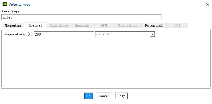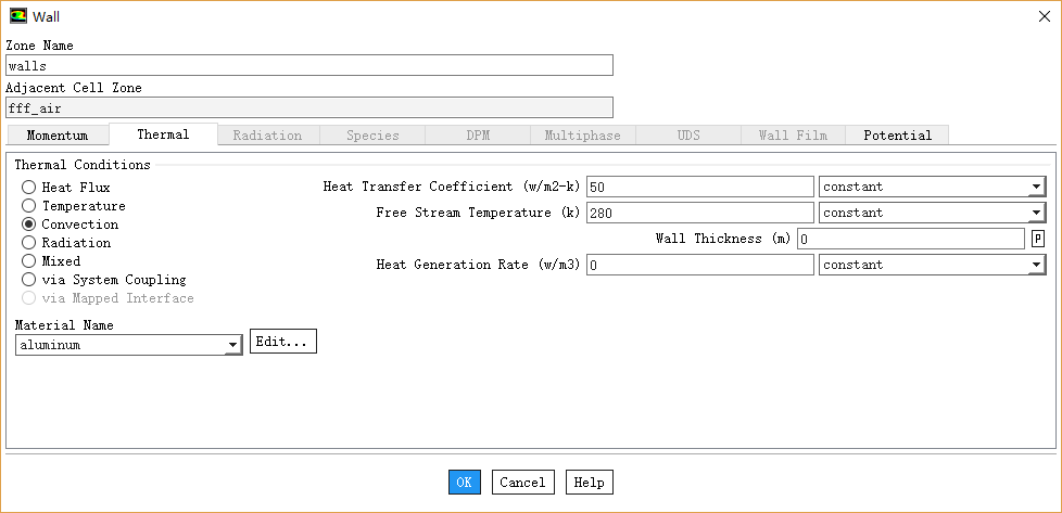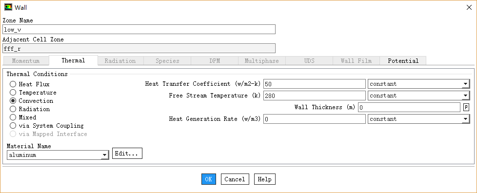 双击模型树节点Boundary Conditions > low_v,弹出对话框中设置热条件为Covection,并设置换热系数为50 w/m2-k,自由流温度280 k