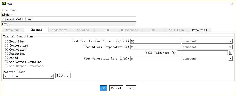 双击模型树节点Boundary Conditions > high_v,设置Thermal标签页下热条件为Convection,并设置换热系数为50 w/m2-k,自由流温度280 k