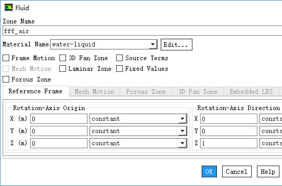 双击模型树节点Cell Zone Conditions > fff_air,弹出对话框中设置Material Name为water-liquid
