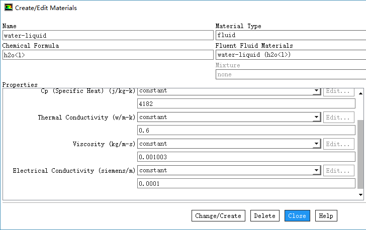 添加材料water-liquid,设置其电导率为0.0001 s/m,如下图所示