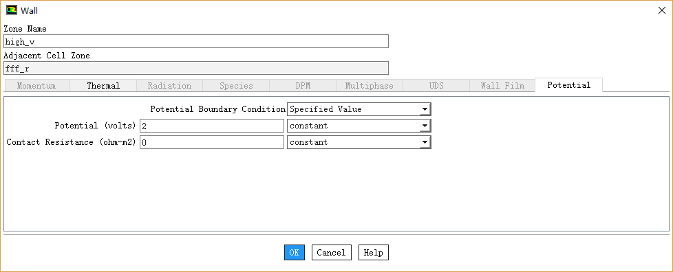 切换至Potential标签页,设置Potential Boundary Condition为Specified Value,并指定Potential为2 v,如下图所示