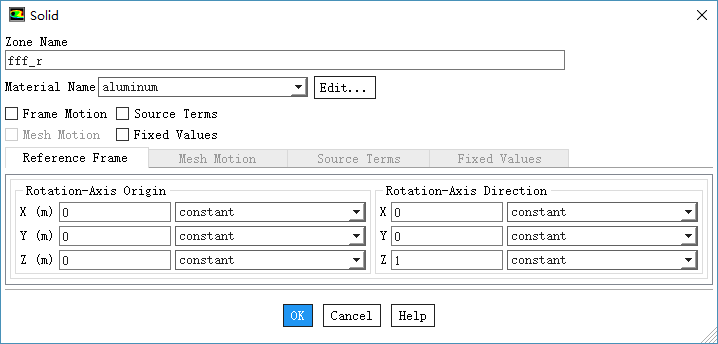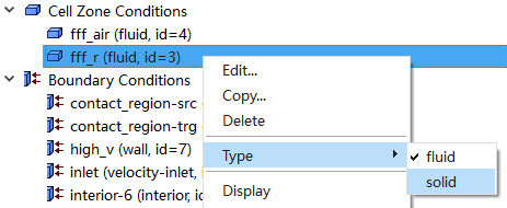 鼠标右键选择模型树节点fff_r,点击弹出菜单项Type → solid将该计算域类型设置为固体类型