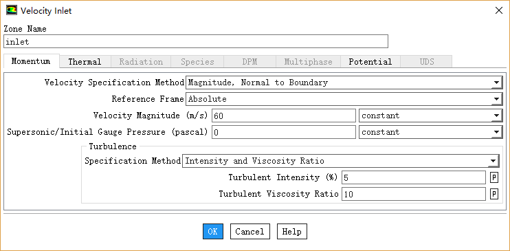 双击模型树节点Boundary Conditions > inlet,如下图所示,在弹出对话框中设置速度为60 m/s