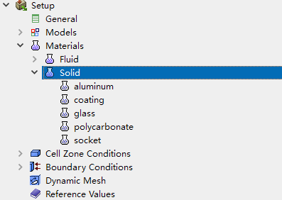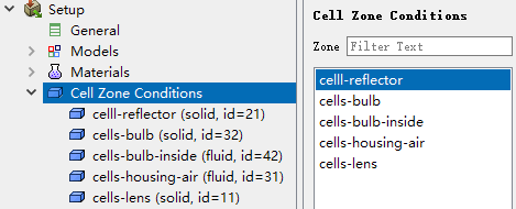 双击模型树节点Cell Zone Conditions,右侧面板列表框中显示了所有计算域