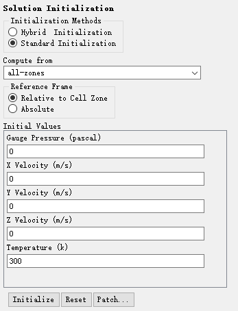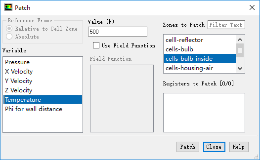 选择Variable为Temperature,选择Zones to Patch为cells-bulb-inside,设置Value为500 k,点击Patch按钮进行初始化