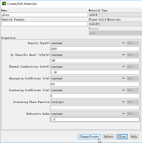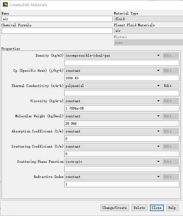 双击模型树节点Materials > Fluid > air,弹出属性修改对话框