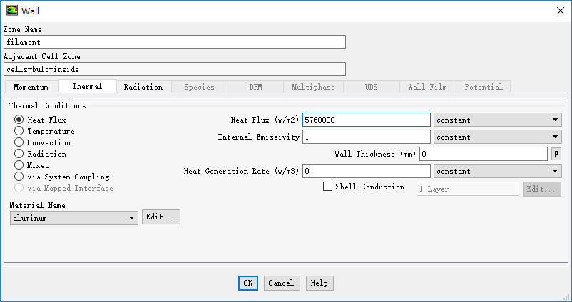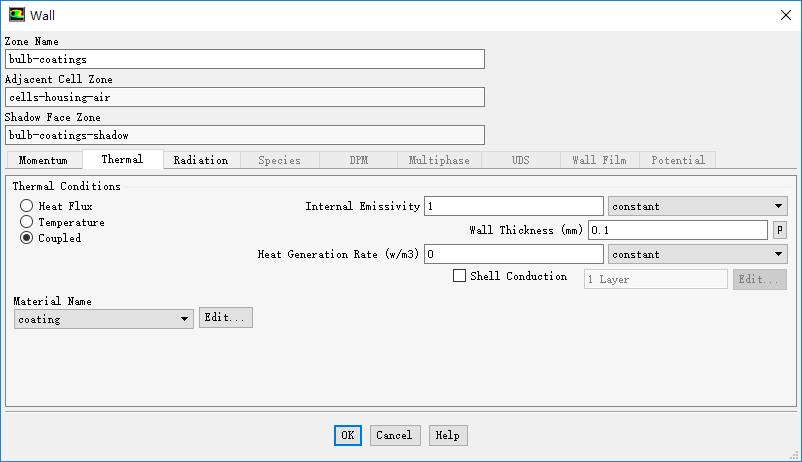 双击列表项bulb-coatings,弹出边界设置对话框,切换至Thermal标签页