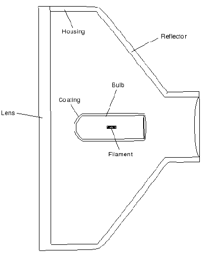 如图所示为汽车前大灯结构。其中灯泡功率为40W, 通过辐射及自然对流与外界交换热量。灯泡由玻璃制成,透镜,外壳和反光镜则由聚碳酸酯制成。