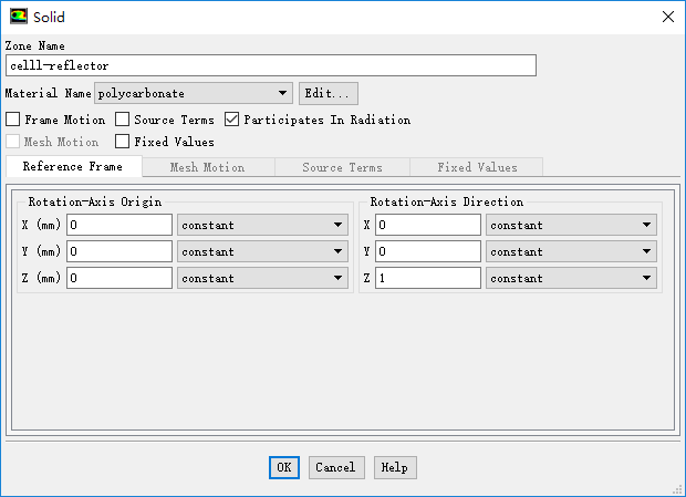 双击列表项cell-reflector,弹出区域设置对话框,设置选项Material Name为polycarbonate,激活选项Participates In Radiation,点击OK按钮关闭对话框