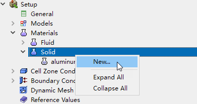 鼠标右键选择模型树节点Materials > Solid,点击弹出菜单项New…新建材料