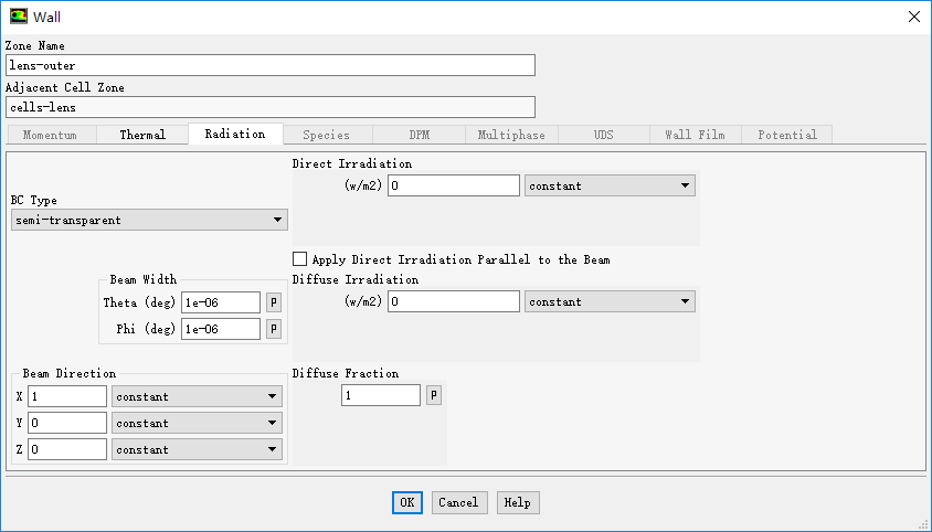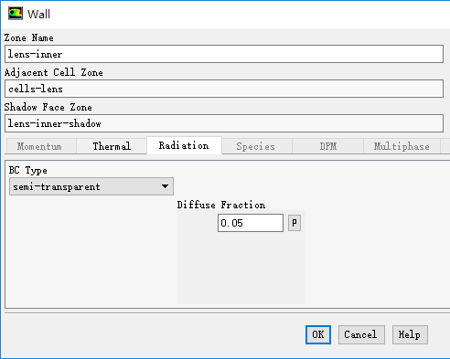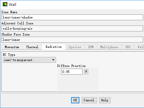 设置BC Type为semi-transparent,设置Diffuse Fraction为0.05,点击OK按钮关闭对话框