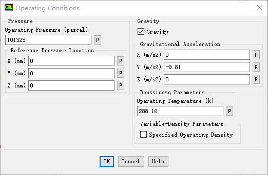 双击模型树节点Cells Zone Conditions,点击右侧面板中按钮Operating Conditions…,弹出操作添加设置对话框