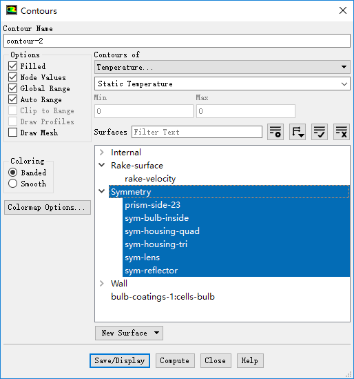 双击模型树节点Results > Contours,弹出对话框中选择查看对称面上温度分布,如下图所示